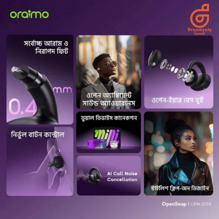 Oraimo OpenSnap ইয়ারবাডস একদম ভিন্নধরনের অভিজ্ঞতা দেয়। ওপেন-ইয়ার ডিজাইনটি খুবই আরামদায়ক ও দীর্ঘক্ষণ পরলেও কানে চাপ পড়ে না। সাউন্ড ক্লিয়ার ও ব্যালান্সড, কল কোয়ালিটিও ভালো।ধন্যবাদ এতো সুন্দর একটি প্রোডাক্ট দেওয়ার জন্য।