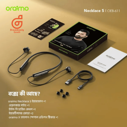 Oraimo Necklace 5 ইয়ারফোনের সাউন্ড কোয়ালিটি দারুণ, নয়েজ ক্যানসেলেশন ভালো কাজ করে এবং ব্যাটারি ব্যাকআপ অনেক লম্বা সময় চলে। নেকব্যান্ড ডিজাইন আরামদায়ক ও স্টাইলিশ — প্রতিদিনের ব্যবহারে এক কথায় চমৎকার!